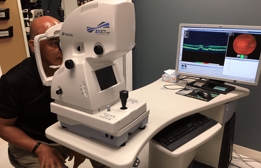 The last test is the OCT (Optical Coherence Tomography) Macula test, which requires you to look into a machine for 30-40 seconds per eye. The OCT is a non-invasive imaging test. OCT uses light waves to take cross-section pictures of your retina.