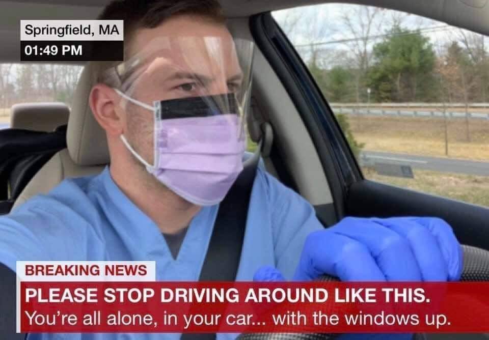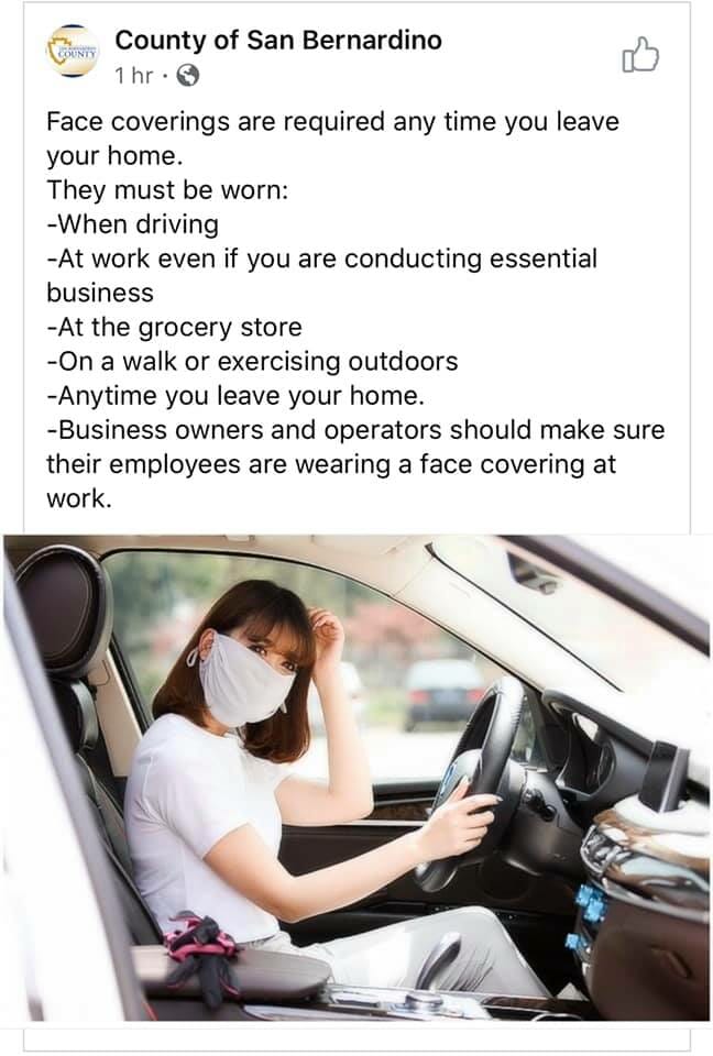 Now if you are just wearing a mask in your car and you have the windows up and you are alone, then wearing a mask isn’t going to help you much, and you look like you are in a panic, that is unless you live in an area like San Bernadino where you could end up in jail or a $1000 fine for not wearing your mask, even in your car.